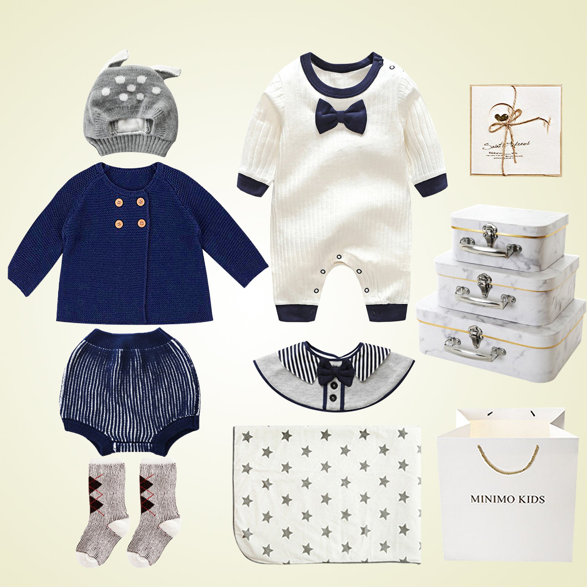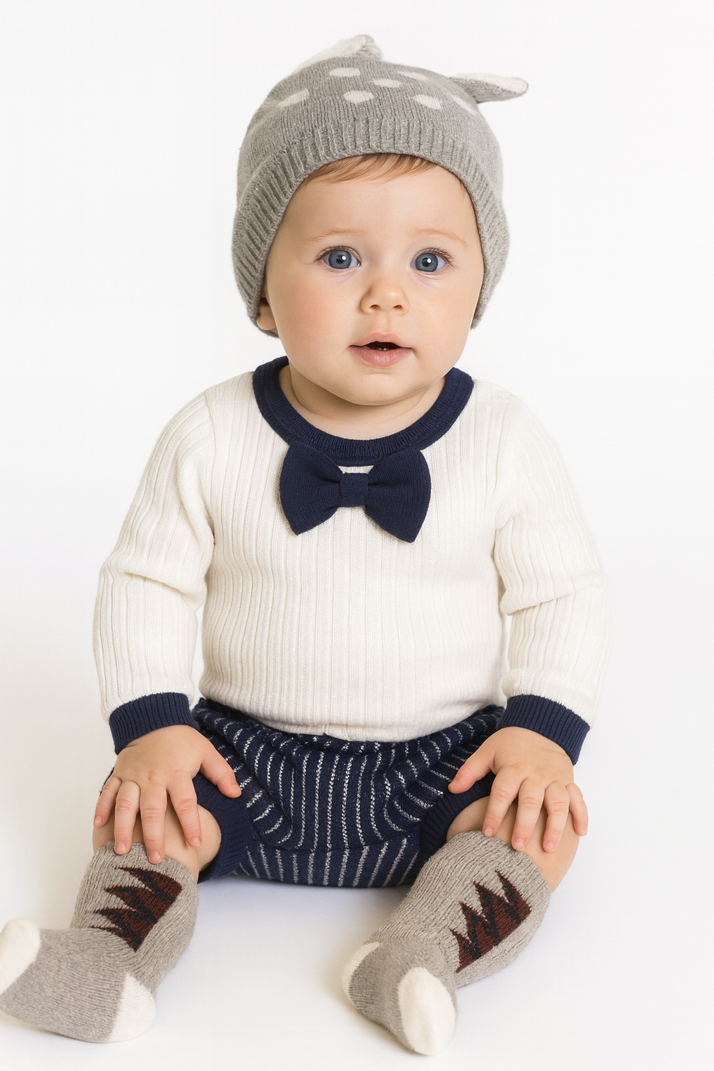 This look features a soft white ribbed romper with a navy bow tie, paired with striped knit shorts, cozy patterned socks, and a cute gray ear hat for extra charm. The premium knit fabrics feel gentle on delicate skin, offering warmth, comfort, and style all day long.